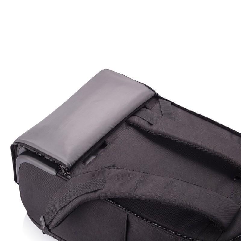 Bobby, plecak na kółkach chroniący przed kieszonkowcami, wykonany z materiałów pochodzących z recyklingu, teleskopowy uchwyt, chowane paski na ramiona, osłona na koła zapobiegająca ubrudzeniu, zintegrowany port USB do ładowania telefonów (power-bank nie jest dołączony), przestronna przegroda główna zamykana na zamek cyfrowy TSA®, wiele kieszeni wewnątrz, przegroda na laptopa do 17", kieszeń z ochroną RFID, rozmiar bagażu podręcznego, wzór zastrzeżony®