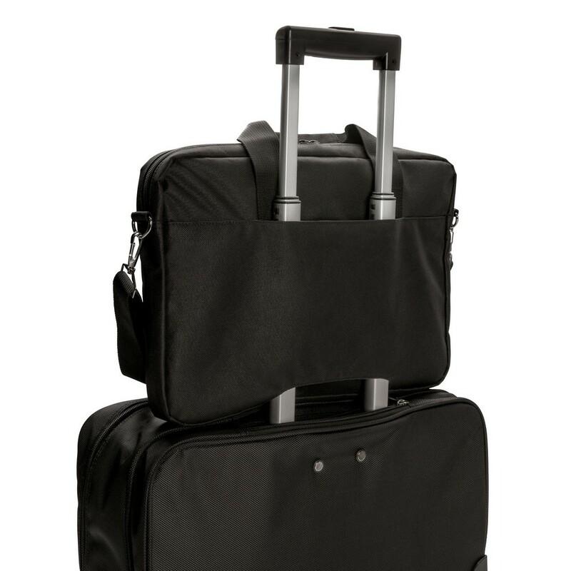 Torba na laptopa 15,4", wykonana z poliestru 600D i 1680D, wewnątrz kieszeń na tablet, z przodu kieszeń na zamek błyskawiczny z miejscem na przybory do pisania i inne akcesoria, regulowany i odpinany pasek na ramię umożliwia noszenie torby na różne sposoby, posiada mocowanie do walizki, nie zawiera PVC