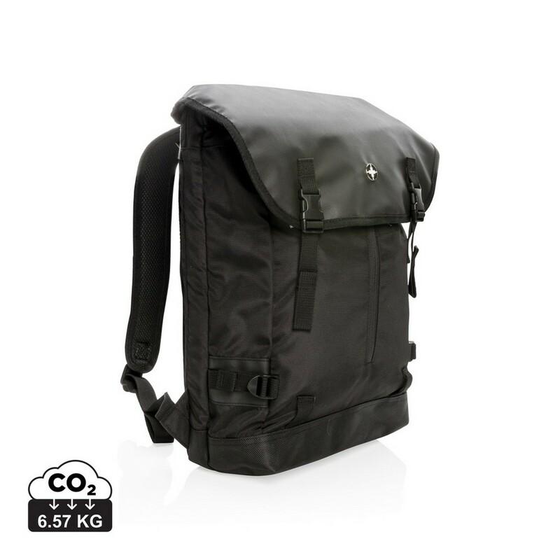 Plecak na laptopa 17", wertykalny design, klapa do zamykania, miękka kieszeń na laptopa, kieszeń na tablet lub czytnik do ebooków, przednie kieszenie na akcesoria, pionowa kieszeń przednia zamykana na zamek błyskawiczny, miękkie, regulowane paski na ramiona, miękki tył, nie zawiera PVC