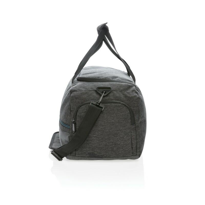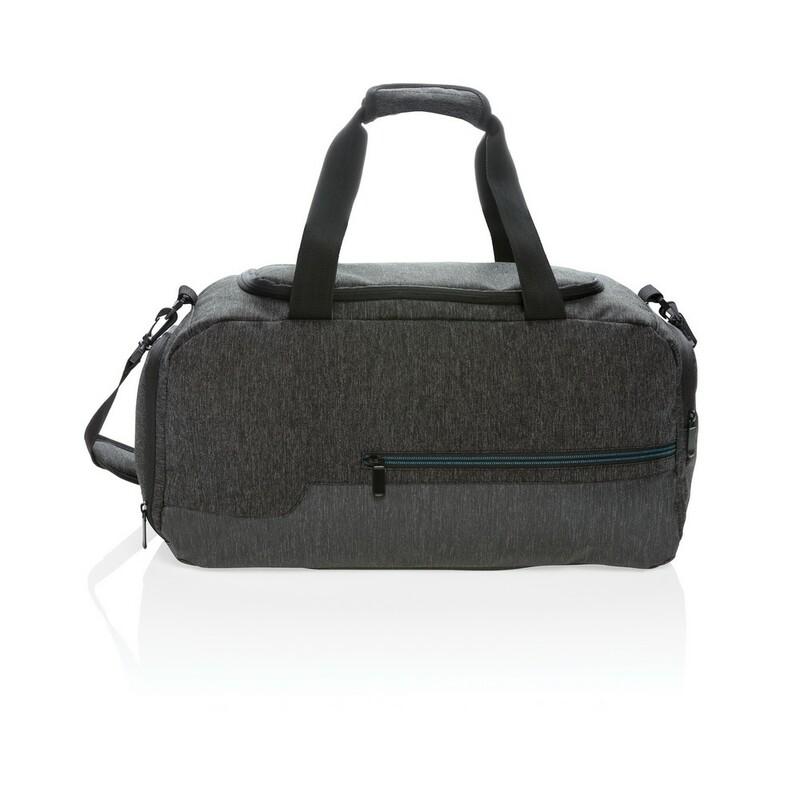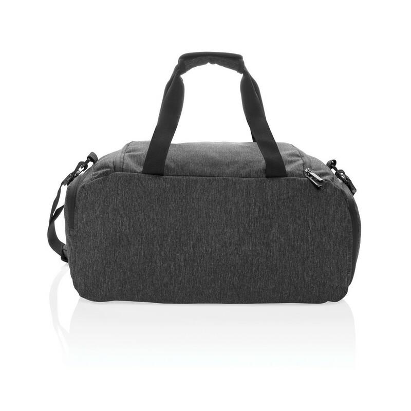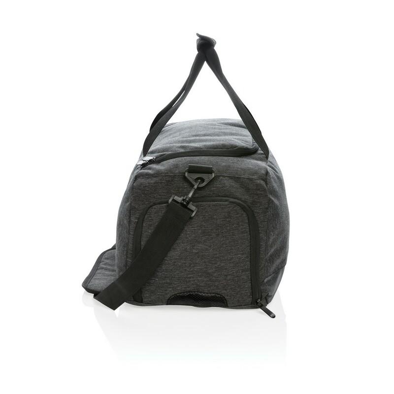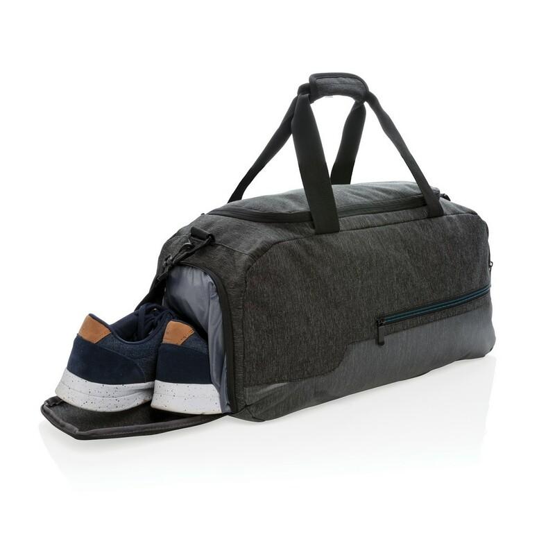 Torba sportowa, podróżna, wykonana z wytrzymałego poliestru 900D, wodoodporna powłoka na zewnątrz, wzmocnione uchwyty, miękki pasek na ramię, możliwość noszenia na różne sposoby, przestronna przegroda główna z wewnętrzną kieszenią na zamek do przechowywania pieniędzy lub innych wartościowych przedmiotów, oddychająca kieszeń na buty, przednia kieszeń na zamek, nie zawiera PVC
