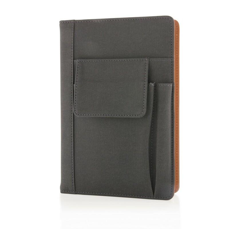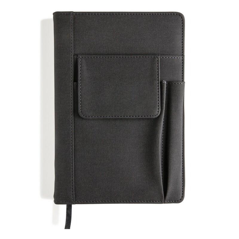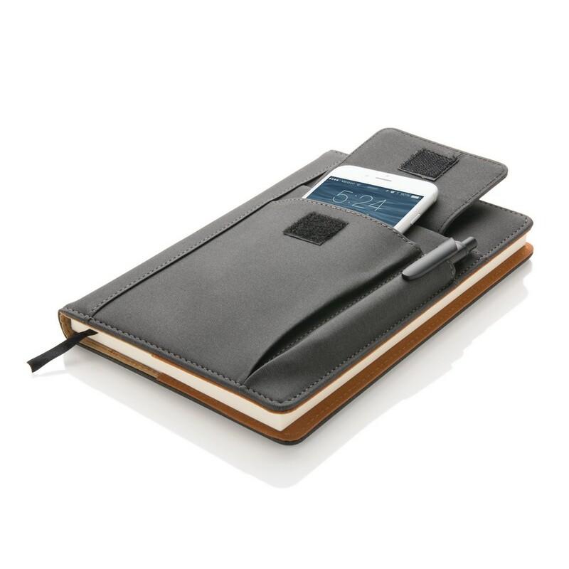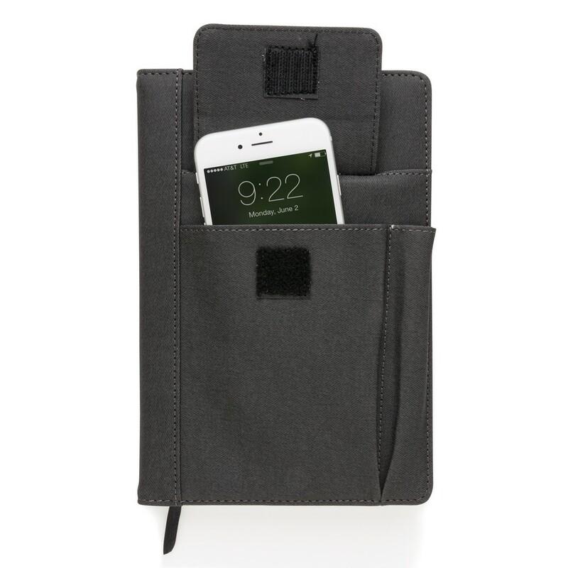 Notatnik A5 (80 kartek 80 g/m2 w linie), pokryta PU okładka wielokrotnego użytku, przednia kieszeń na telefon (14 x 10 cm), miejsce na przybory do pisania, czarna tasiemka zakładkowa, po zapisaniu wszystkich stron okładkę można użyć ponownie, wystarczy wymienić notatnik na nowy