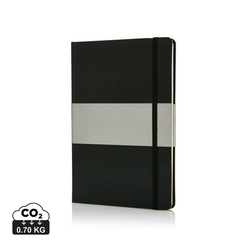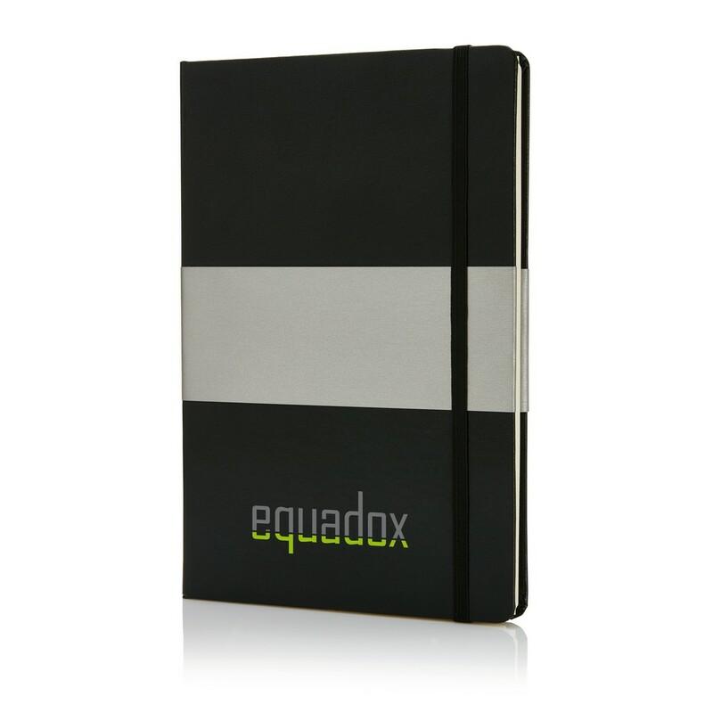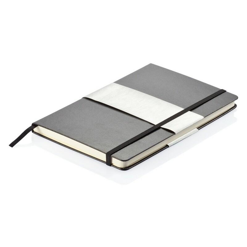 Notatnik A5 (80 kremowych kartek 80 g/m2 w linie), twarda okładka, tasiemka zakładkowa, elastyczna opaska do zamykania, obwoluta, zaokrąglone rogi