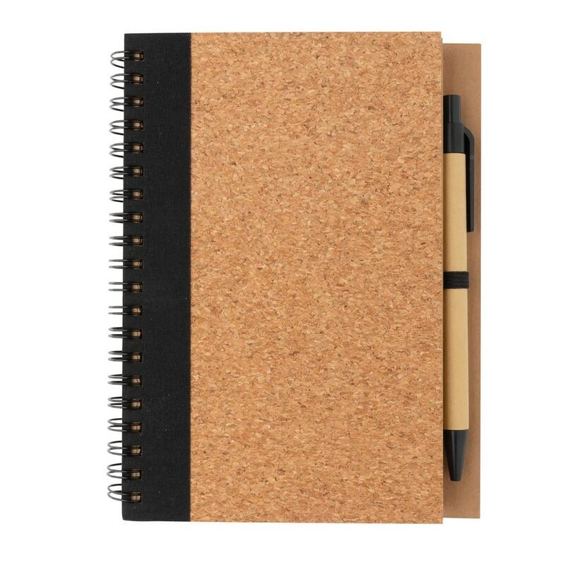 Notatnik (70 kremowych kartek z papieru makulaturowego 70 g/m2 w linie), korkowa okładka, spiralne bindowanie, dopasowany kolorystycznie długopis z papieru kraftowego w komplecie, niemiecki wkład Dokumental® w kolorze niebieskim w komplecie, długość pisania ok. 600 m