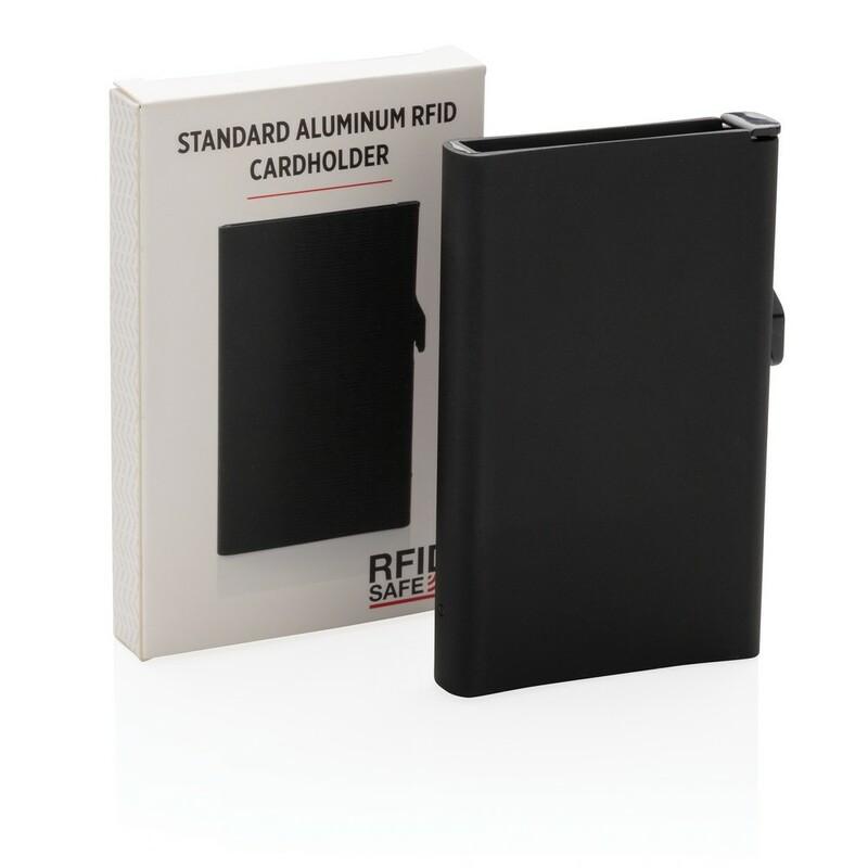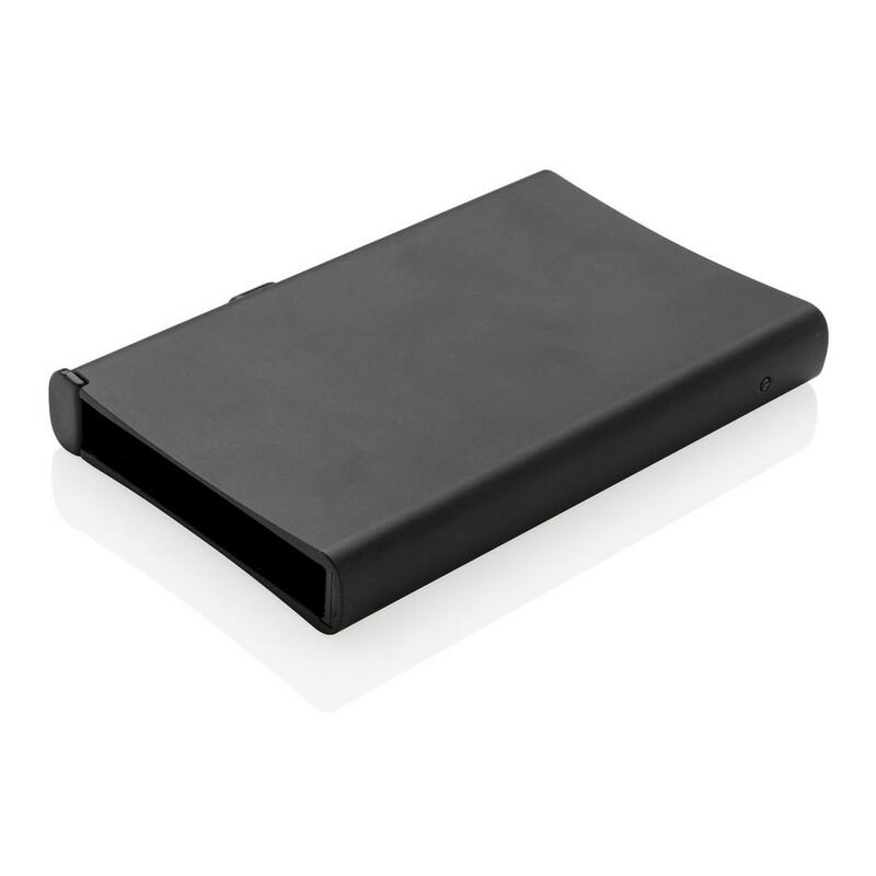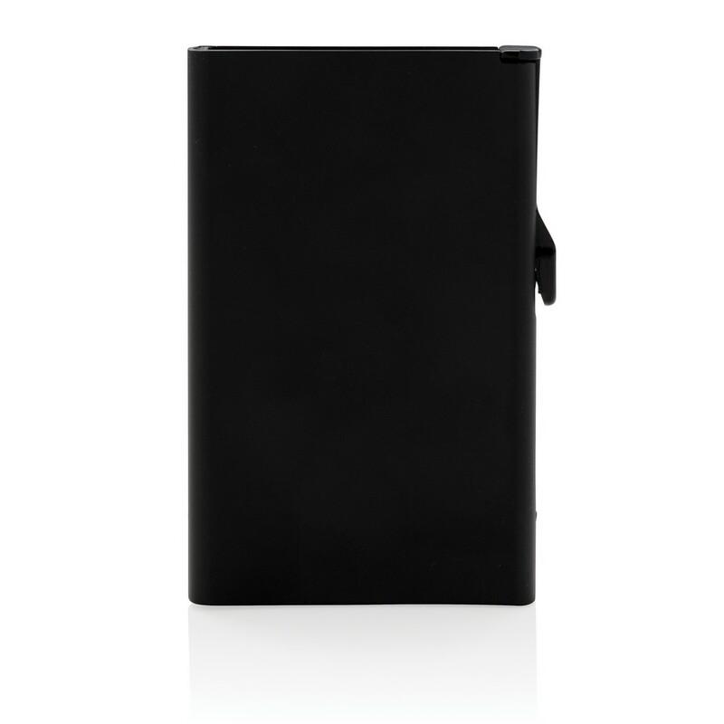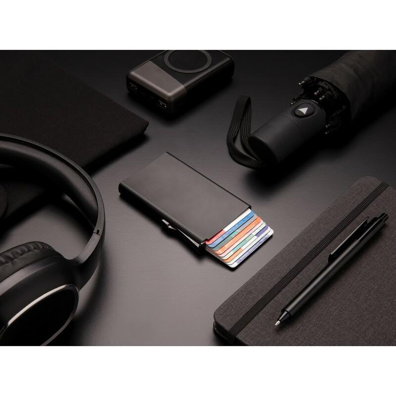 Etui na karty kredytowe z ochroną RFID, wykonane z wytrzymałego aluminium, mieści do 10 kart lub do 6 z tłoczeniem, posiada suwak boczny do wysuwania kart