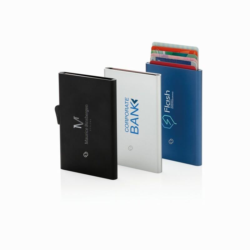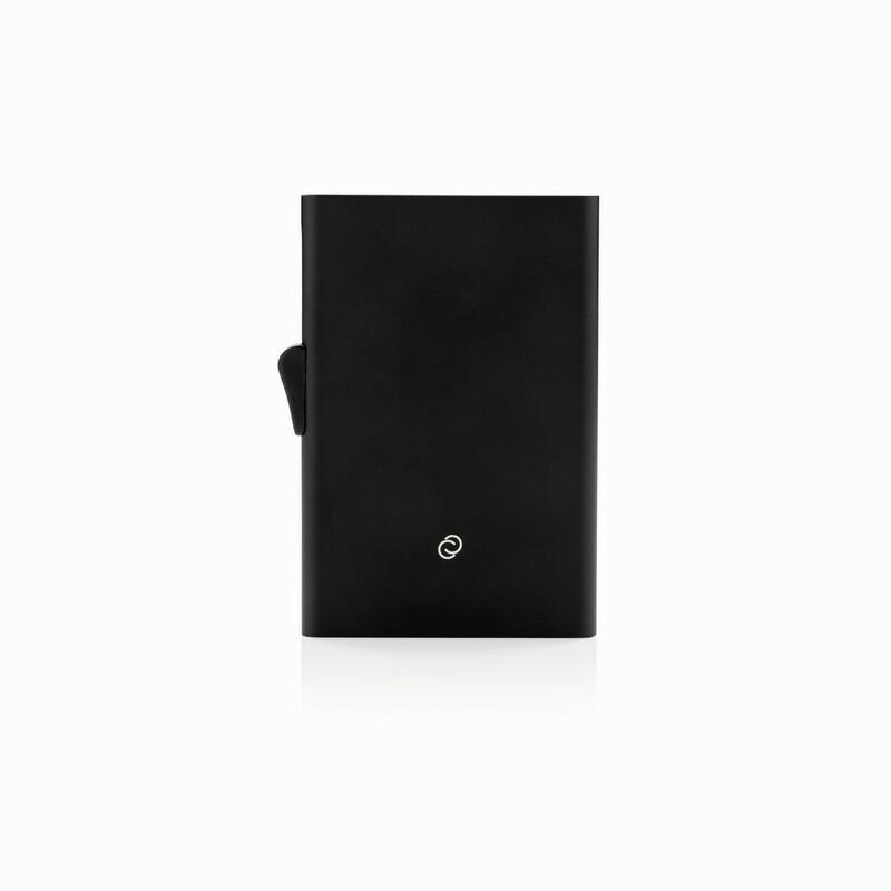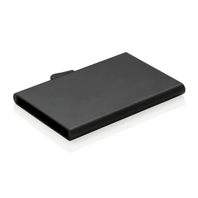 Solidne etui na karty kredytowe C-Secure z ochroną RFID, mieści do 7 kart lub do 5 z tłoczeniem, posiada suwak boczny do wysuwania kart, wykonane z aluminium