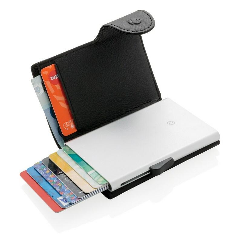 Portfel, etui na karty kredytowe z ochroną RFID, wykonany z wytrzymałego aluminium, mieści do 7 kart lub do 5 z tłoczeniem, posiada suwak boczny do wysuwania kart, miejsce na gotówkę w portfelu