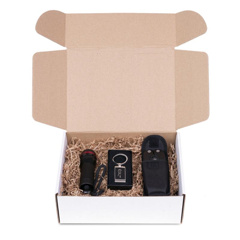 Zestaw upominkowy składający się z narzędzia wielofunkcyjnego (R17508.02), latarki (R35676.02) i breloka (R73184.02). Całość pakowana jest w tekturowe pudełko wyściełane naturalnym wypełniaczem (wełna drzewna). W tekturowym pudełku poszczególne elementy zestawu są w opakowaniach fabrycznych.