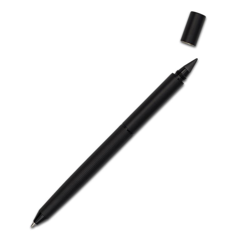 Długopis oraz wieczny ołówek w jednym. Długość pisania odpowiada 100 zwykłym ołówkom. Wkład długopisu w kolorze niebieskim. Pakowany w prezentowym pudełku.