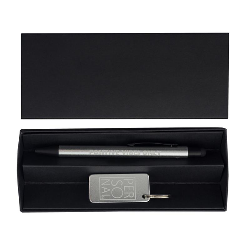 Zestaw promocyjny składający się z długopisu i breloczka wykonanych z aluminium pochodzącego z recyklingu. Całość zapakowana w czarne, kartonowe pudełko. Długopis z niebieskim wkładem.