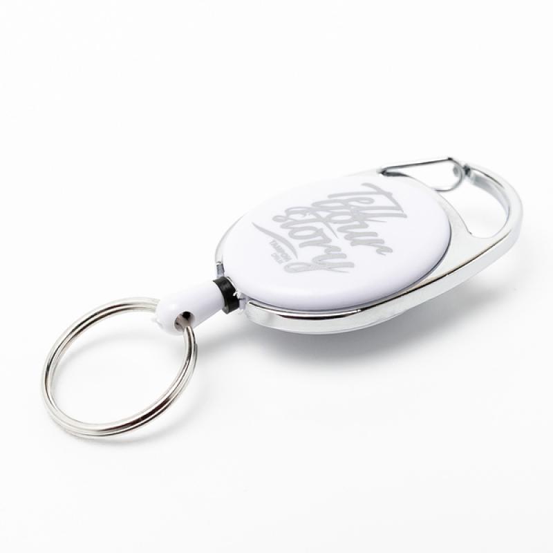 Wykonany z metalu i plastiku ski-pass z karabińczykiem, metalowym kółkiem i klamrą do paska. Długość linki 86 cm.