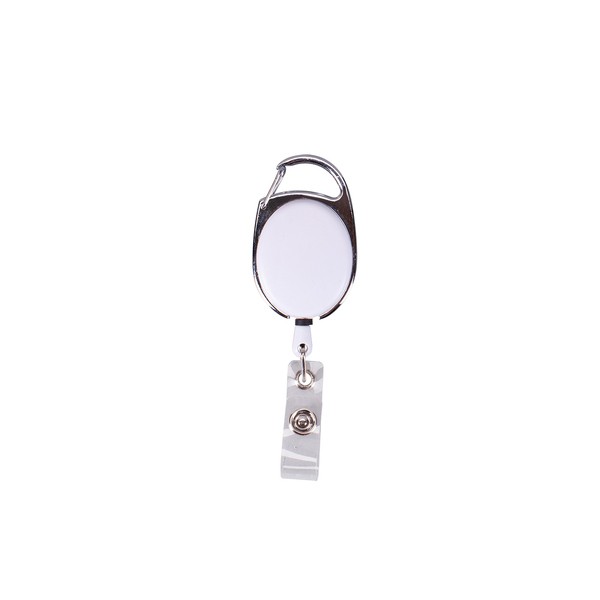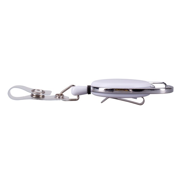 Wykonany z metalu i plastiku ski-pass z winylowym troczkiem, karabińczykiem i klamrą do paska. Długość linki 86 cm.