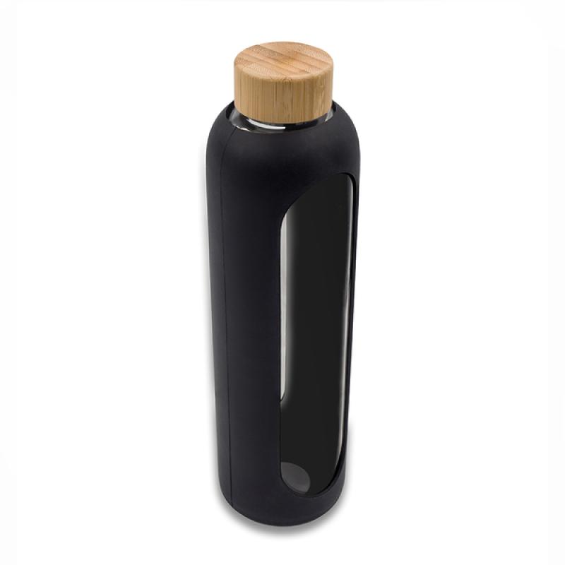 Szczelna butelka ze szkła borokrzemowego w silikonowym etui i bambusową nakrętką. Pojemność 1100 ml.