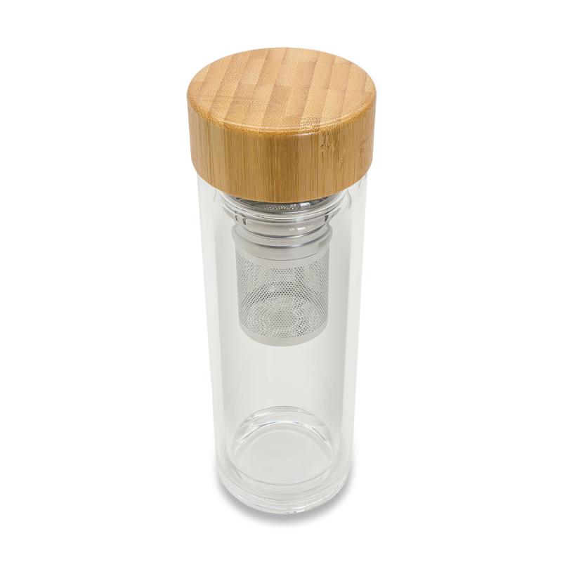 Butelka wykonana z borokrzemowego szkła o podwójnych ściankach, o pojemności 400 ml. Wyposażona w zaparzacz, który umożliwia łatwe przygotowanie ulubionych naparów i herbat. Bambusowa nakrętka nadaje jej naturalny, elegancki wygląd.