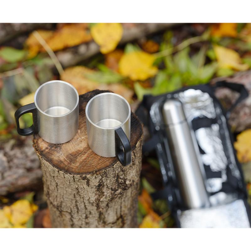 Zestaw izotermiczny składający się z torby izotermicznej na ramię, termosu o podwójnych ściankach o pojemności 450 ml i dwóch kubków o pojemności 180 ml. Wewnątrz naczyń stal 18/8 o podwyższonej jakości. Utrzymuje temperaturę przez 20 godzin.