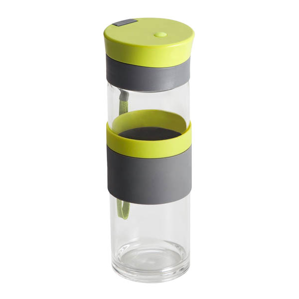 Szczelny bidon o pojemności 440 ml. Wykonany ze specjalnego szkła borokrzemowego, które jest nadzwyczaj przyjazne naszemu zdrowiu, a także lżejsze od tradycyjnego szkła. Bidon wyposażony jest w uchwyt na nadgarstek, opaskę do trzymania oraz szczelne zamknięcie typu leak proof zapobiegające wyciekaniu płynów. Nie zawiera BPA.
