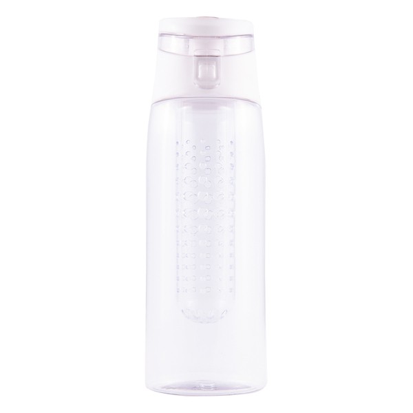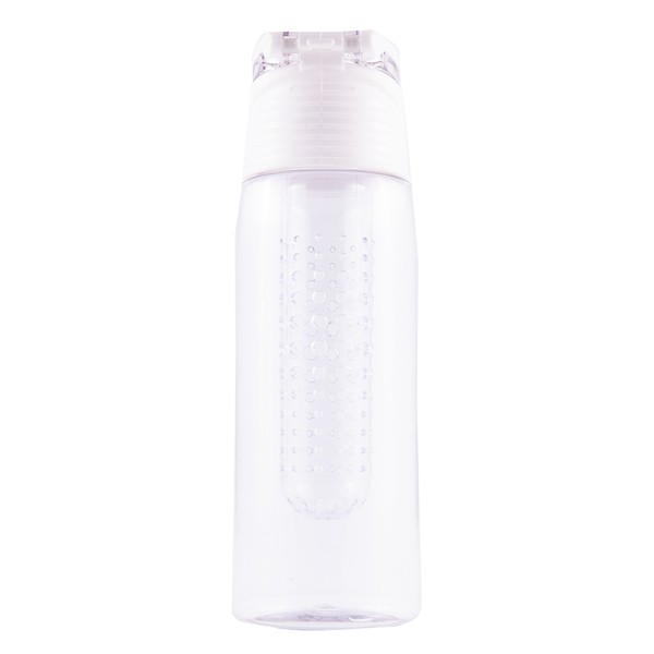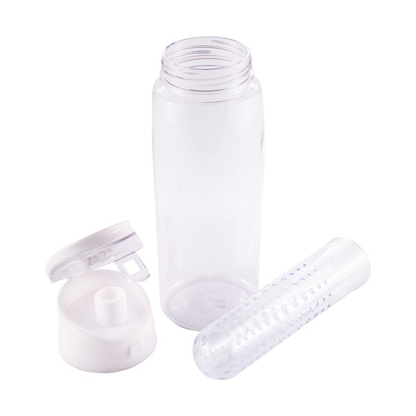 Lekki, szczelny bidon z solidnym zamknięciem, wyposażony w pojemnik na kawałki owoców lub miętę. Wykonany z tritanu - wytrzymałego, przezroczystego tworzywa niezmieniającego smaku napoju. Wolny od BPA.