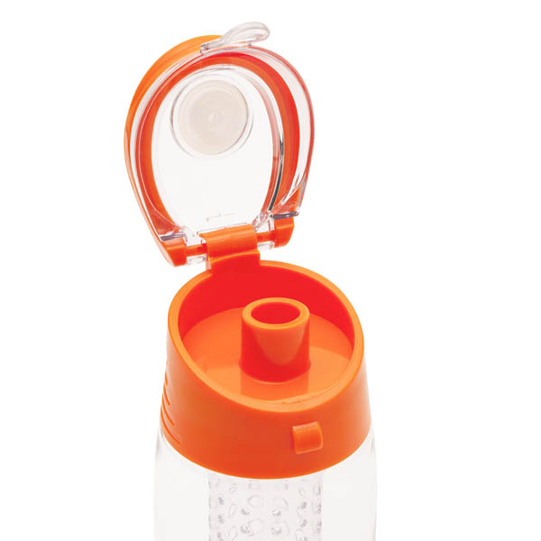 Lekki, szczelny bidon z solidnym zamknięciem, wyposażony w pojemnik na kawałki owoców lub miętę. Wykonany z tritanu - wytrzymałego, przezroczystego tworzywa niezmieniającego smaku napoju. Wolny od BPA.