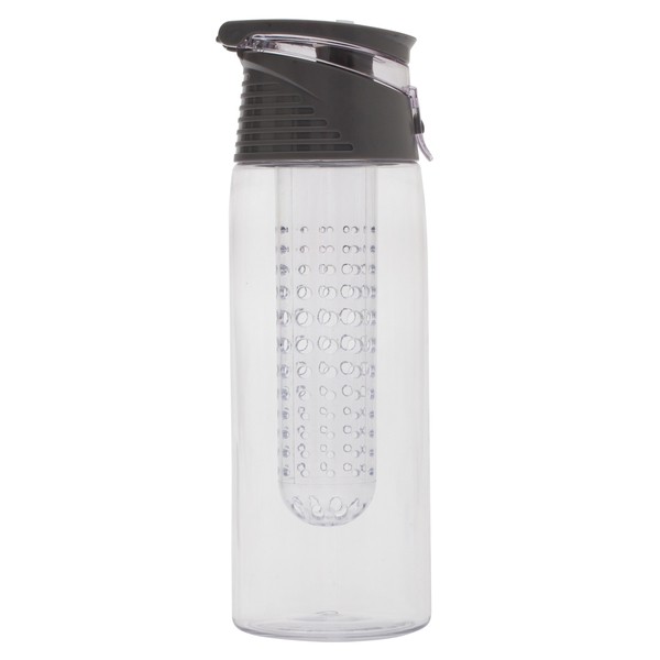 Lekki, szczelny bidon z solidnym zamknięciem, wyposażony w pojemnik na kawałki owoców lub miętę. Wykonany z tritanu - wytrzymałego, przezroczystego tworzywa niezmieniającego smaku napoju. Wolny od BPA.