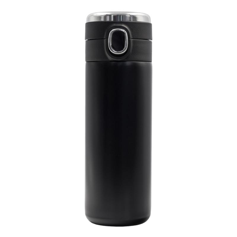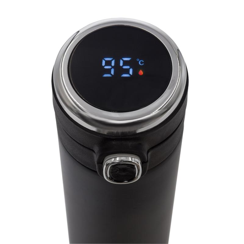 Szczelny termos próżniowy z dwiema stalowymi ściankami. Wnętrze wykonane ze stali nierdzewnej 18/8 o podwyższonej jakości. Posiada blokadę zamknięcia pokrywki i wbudowany termometr, który przy dotknięciu wyświetlacza pokazuje temperaturę napoju. Utrzymuje temperaturę powyżej 40°C do 15 godzin.