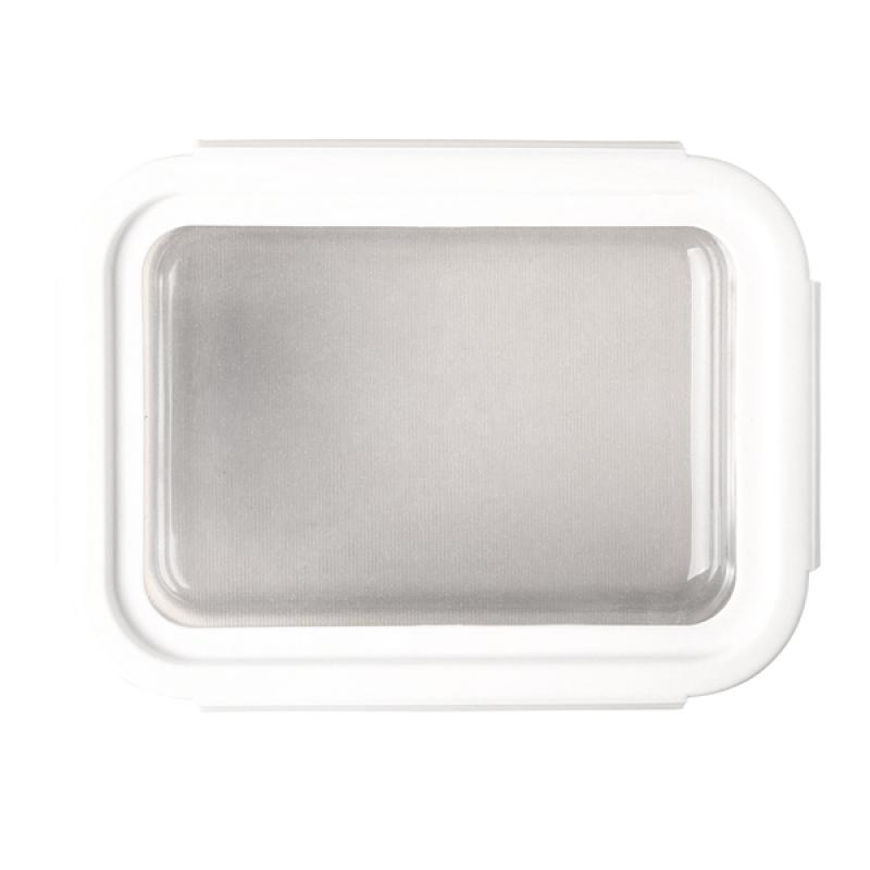 Szklany pojemnik na lunch (900 ml) z hermetyczną pokrywką z silikonu. Elastyczna pokrywka pozwala dopasować się do zawartości pojemnika zwiększając jego objętość. Można używać w mikrofalówce, piekarniku, zamrażarce oraz myć w zmywarce. Zakres temperatur dla szkła: -40 ~400 ℃. Zakres temperatur dla pokrywki: -20 ~120 ℃
