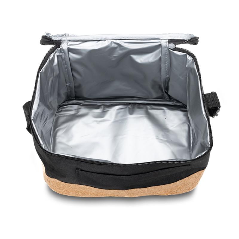 Torba termoizolacyjna na lunch z korkowym wykończeniem. Wewnątrz materiał PEVA, który zapewnia utrzymanie żywności i napojów w stałej temperaturze poza domem. Doskonale sprawdzi się w codziennym przenoszeniu posiłków do pracy, jak również podczas plażowania, podróży czy pikniku. Torba wyposażona jest w regulowany pasek na ramię, boczną zewnętrzną kieszonkę i zamykana jest na zamek.