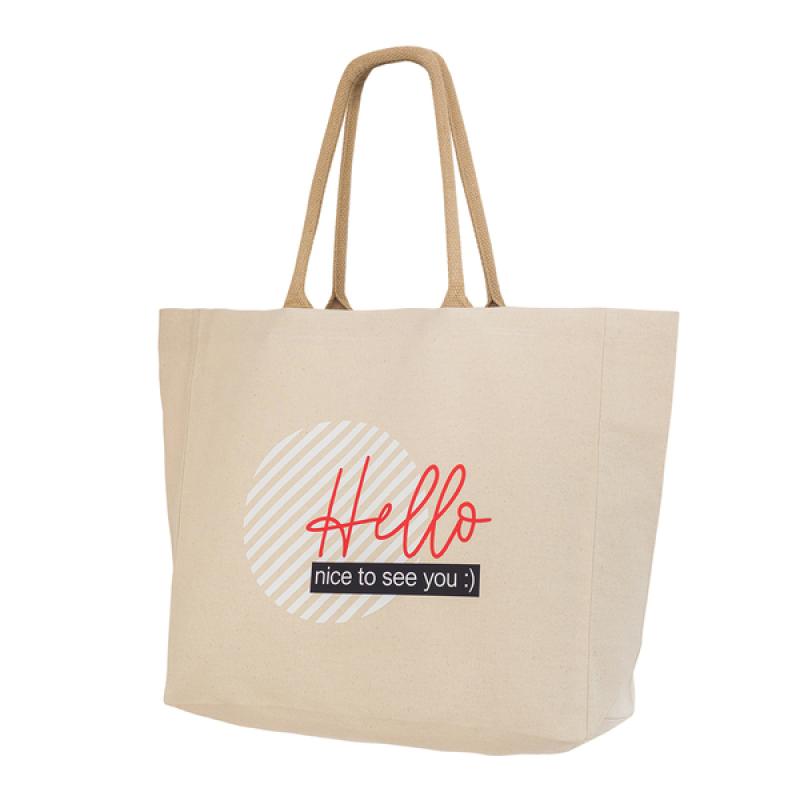 Bardzo pojemna torba wykonana z bawełny 280g/m2. Posiada długie uchwyty z bawełny. Szerokość klina 16 cm.