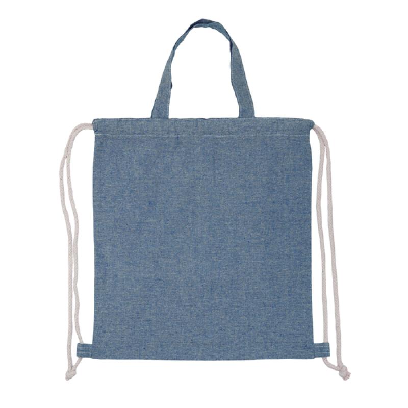 Plecak z melanżowej bawełny 140 g/m2 z plecionymi sznurkami i uchwytami. Może służyć jako plecak bądź torba na zakupy.