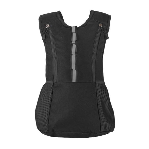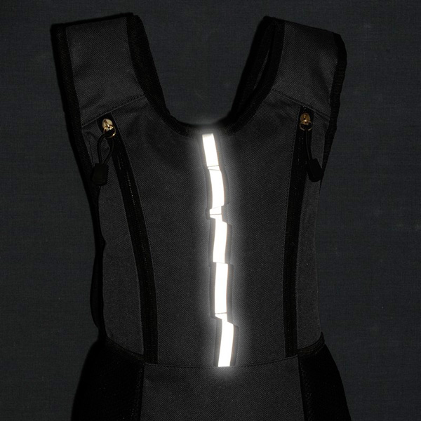 Wykonany z poliestru 600 D plecak sportowy z bocznymi kieszonkami. Wyposażony w regulowane szelki i odblaskową naszywkę. Pojemność 14 litrów.