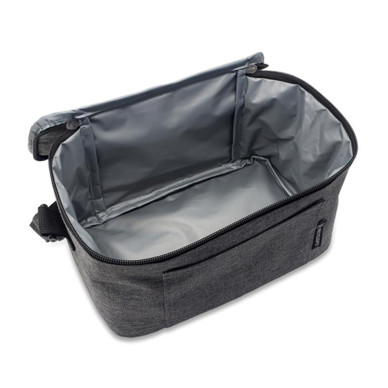 Torba termoizolacyjna wykonana z materiału RPET 600D. Wyposażona w kieszonkę zewnętrzną, z regulowanym paskiem na ramię. Wewnątrz materiał PEVA, który zapewnia utrzymanie żywności i napojów w stałej temperaturze.