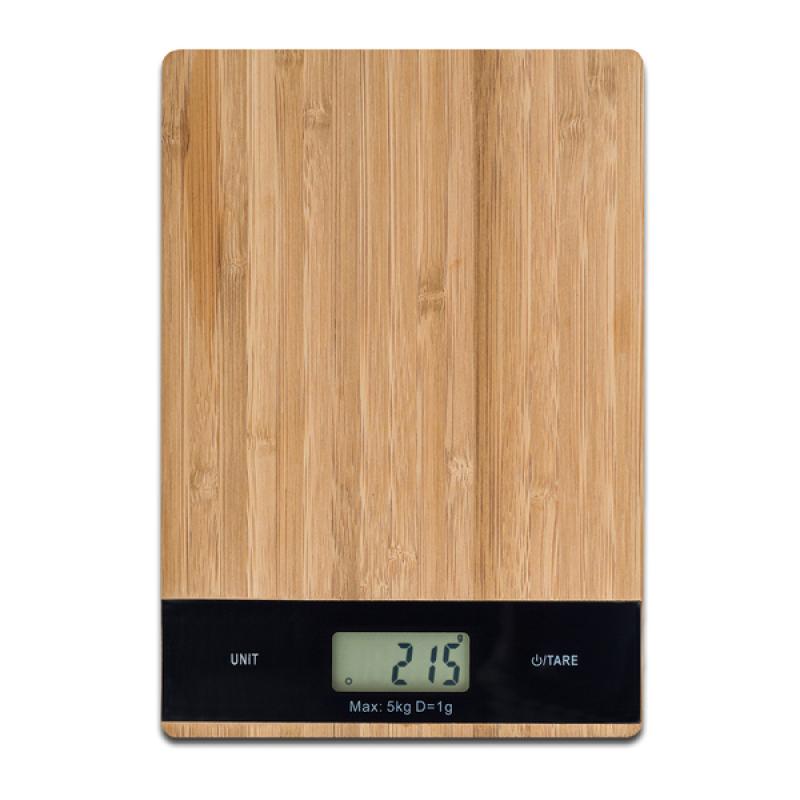 Cyfrowa waga kuchenna do 5 kg w bambusowym wykończeniu. Waga została wyposażona w funkcję automatycznej kalibracji oraz odliczania wagi pojemnika (tarowania). Dokładność pomiaru: 1 g. Zasilanie: 1 bateria CR2032 (w zestawie).