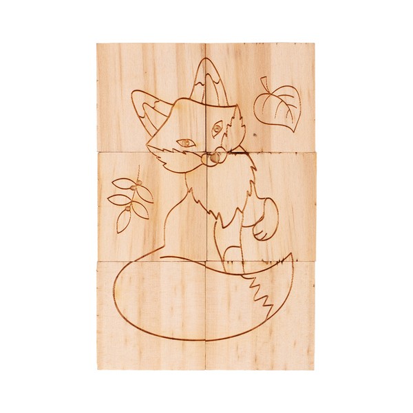 Drewniana układanka. Tradycyjna zabawka edukacyjna dla dzieci. Zestaw składa się z 6 klocków oraz sześciu obrazków do ułożenia, przedstawiających zwierzęta leśne.