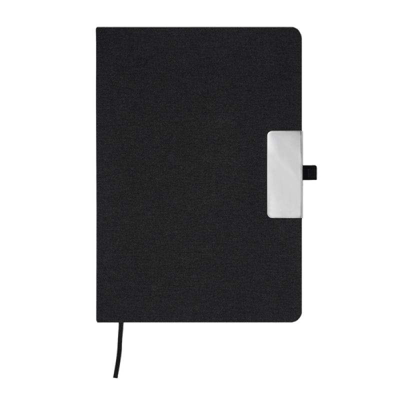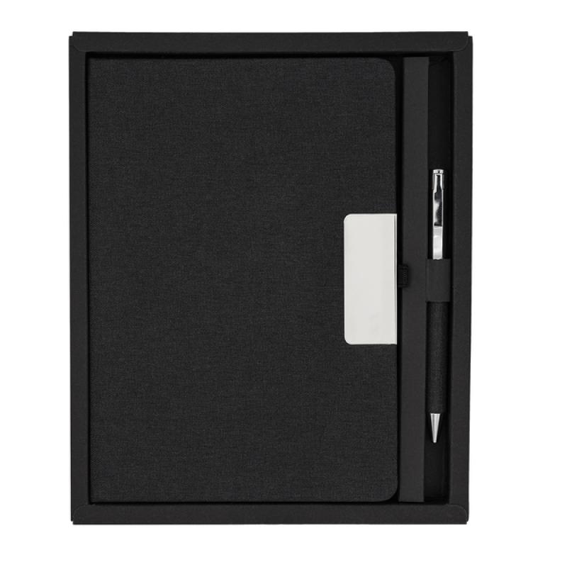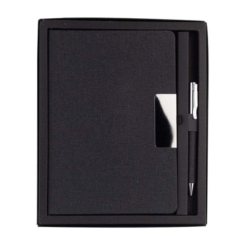 Zestaw upominkowy w pudełku. Notatnik A5 w twardej okładce RPET, z metalowym elementem; 80 kartek w kratkę, o gramaturze 70 g/m². Metalowy długopis w tkaninie RPET i srebrnymi detalami. Niebieski wkład 1,0 mm.