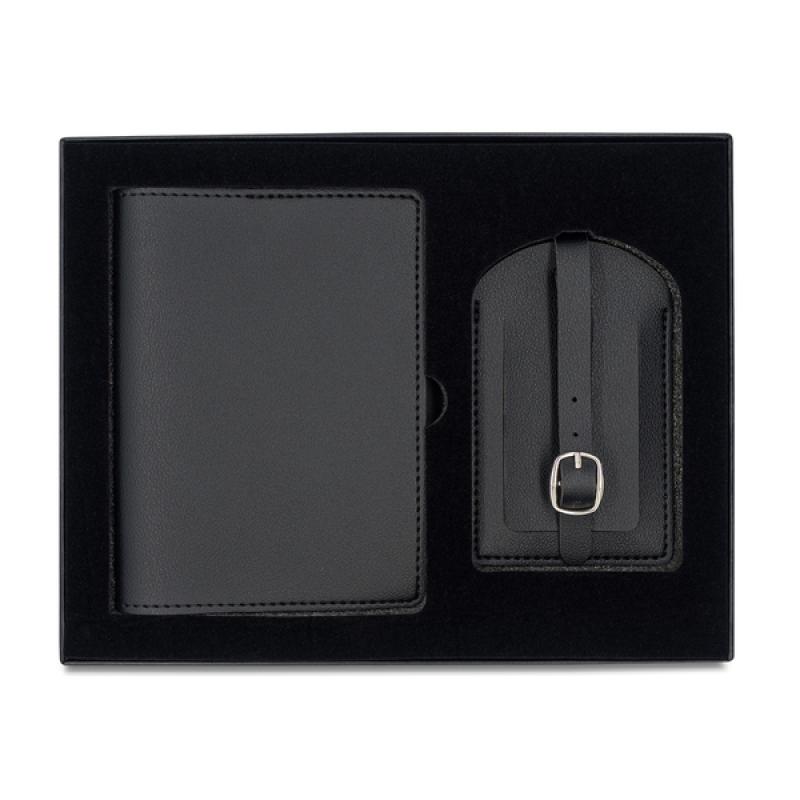 Zestaw akcesoriów przydatnych w podróży: etui na paszport i zawieszka na bagaż.