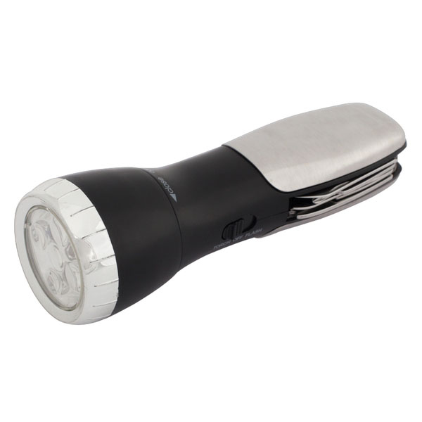 12 - funkcyjne narzędzie z latarką o strumieniu światła 20 lm. 4 białe dody LED i 1 czerwona z migającym światłem ostrzegawczym. Zawiera: latarka LED, nożyczki, skrobak do ryb, końcówka do haczyków wędkarskich, wkrętak krzyżowy, piła, wkrętaki płaskie, otwieracz do konserw, otwieracz do butelek, nóż, pilnik, klucze oczkowe.