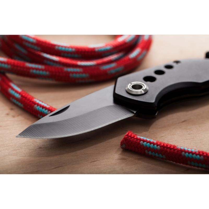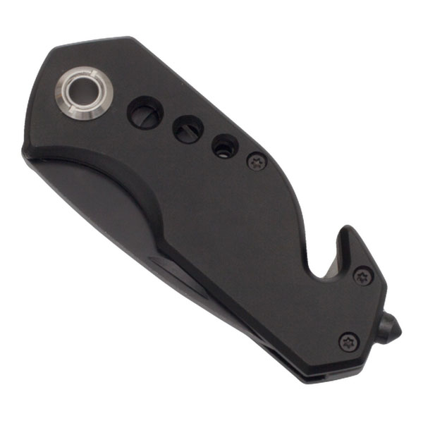 Wykonany z metalu 2CR13 składany nóż z ostrzem o długości 58 mm, blokadą ostrza, młotkiem do rozbicia szyb, przecinakiem do samochodowych pasów bezpieczeństwa i klipem do zaczepienia. Zapakowany w czarnym poliestrowym etui.