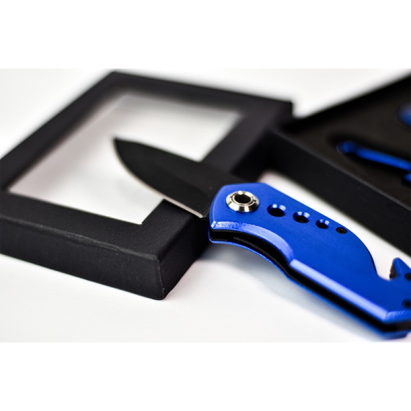 Wykonany z metalu 2CR13 składany nóż z ostrzem o długości 58 mm, blokadą ostrza, młotkiem do rozbicia szyb, przecinakiem do samochodowych pasów bezpieczeństwa i klipem do zaczepienia. Zapakowany w czarnym poliestrowym etui.