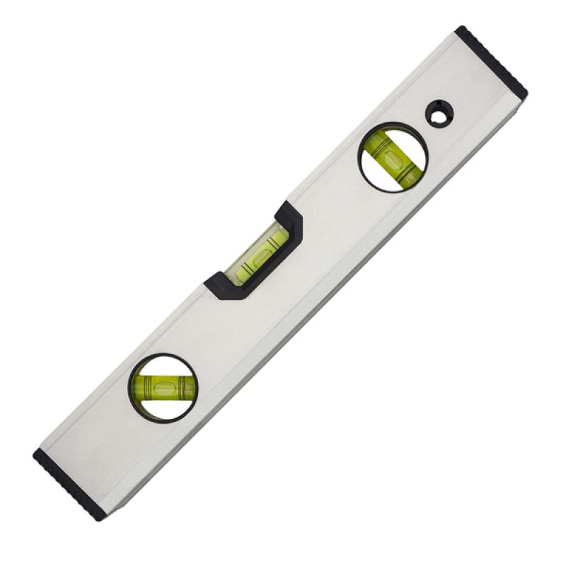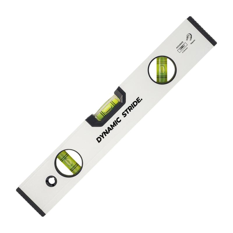 Aluminiowa poziomica o długości 30 cm wyposażona w magnetyczną podstawę oraz 3 libelle pomiarowe: 0˚, 90˚ i 45˚.