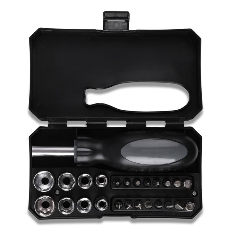 Zestaw narzędzi w pudełku. Zawiera: uchwyt wkrętakowy, uniwersalny, magnetyczny (¼”), wkrętak Phillips (krzyżakowy) – 5 rozmiarów, wkrętak płaski – 4 rozmiary, adapter (¼”), klucz imbusowy – 4 rozmiary, klucz Torx – 4 rozmiary, klucz nasadowy/oczkowy – 8 rozmiarów (5-12).