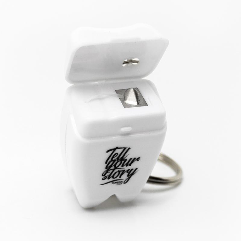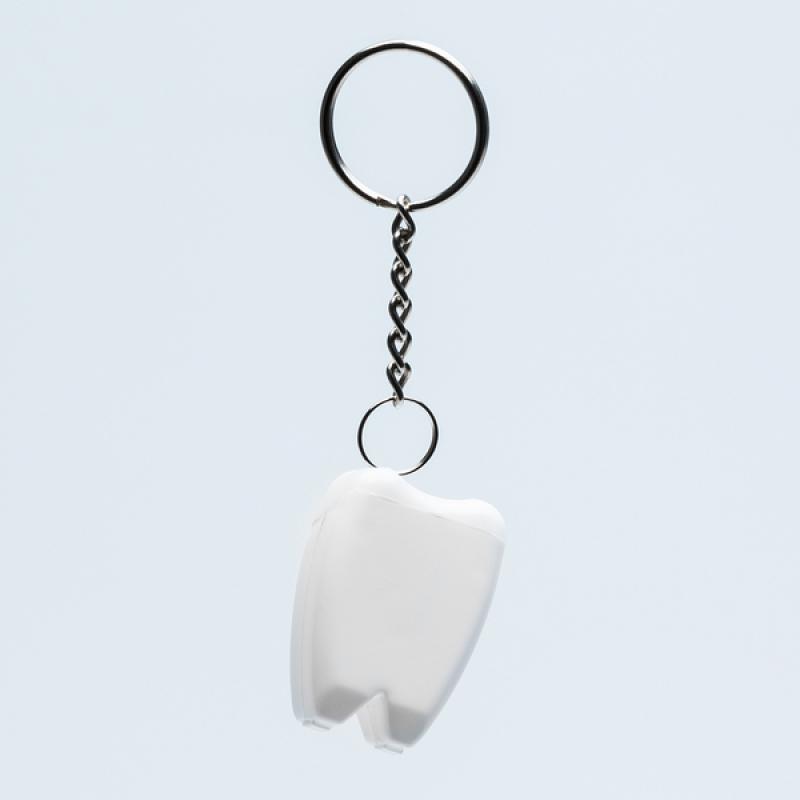 Brelok w kształcie ząbka z nicią dentystyczną o długości 5 m.