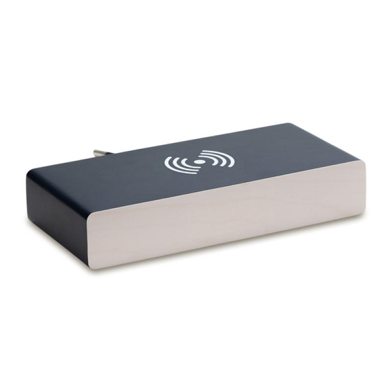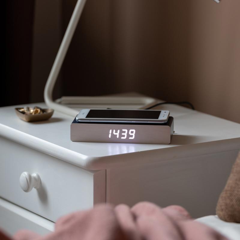 Biurkowa ładowarka indukcyjna z zegarem, wyświetla także datę i temperaturę. Zasilana przez kabelek USB oraz 2 bateriami typu LR1130. Funkcje urządzenia: naprzemienne wyświetlanie godziny, daty oraz temperatury. Możliwość regulacji poziomu jasności wyświetlacza, 3 alarmy. Ustawiony na tryb oszczędzania energii zegar jest uśpiony, a wyświetlacz nieaktywny. Wystarczy tylko klasnąć w dłonie lub dotknąć zegara, by wzbudzić wyświetlacz. Kabel i baterie dołączone w zestawie. Ładowarka działa z telefonami posiadającymi funkcję ładowania indukcyjnego. Moc: 5W.