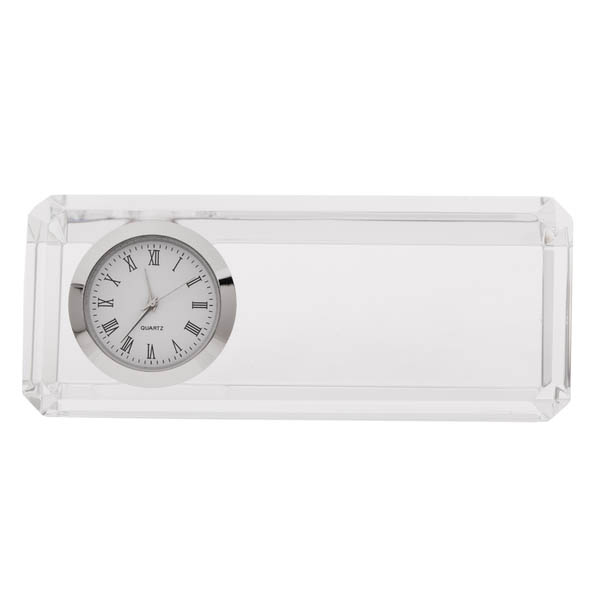Kryształowy przycisk do papieru z zegarem. Pakowany w czarne upominkowe pudełko. W zestawie bateria AG4 1szt.