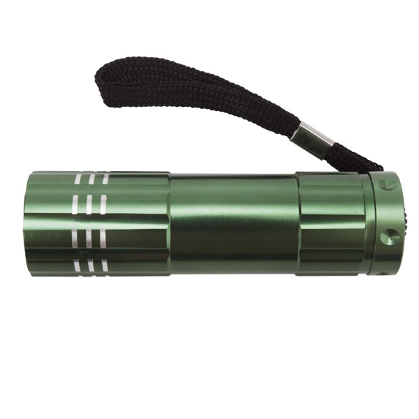 9 diodowa latarka LED wykonana z aluminium. Zasilana 3 bateriami AAA (dołączone).