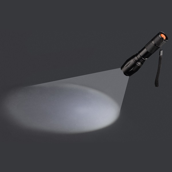 Latarka LED o strumieniu światła 250 lumenów i zasięgu 50 metrów. Wyposażona w diodę LED (3 W). Trzy tryby świecenia: mocny, oszczędzający, migający. Funkcja zoom. Pakowana w czarne etui z poliestru. Zasilana 3 bateriami typu AAA (dołączone). Żywotność LED – 100 000 godzin.