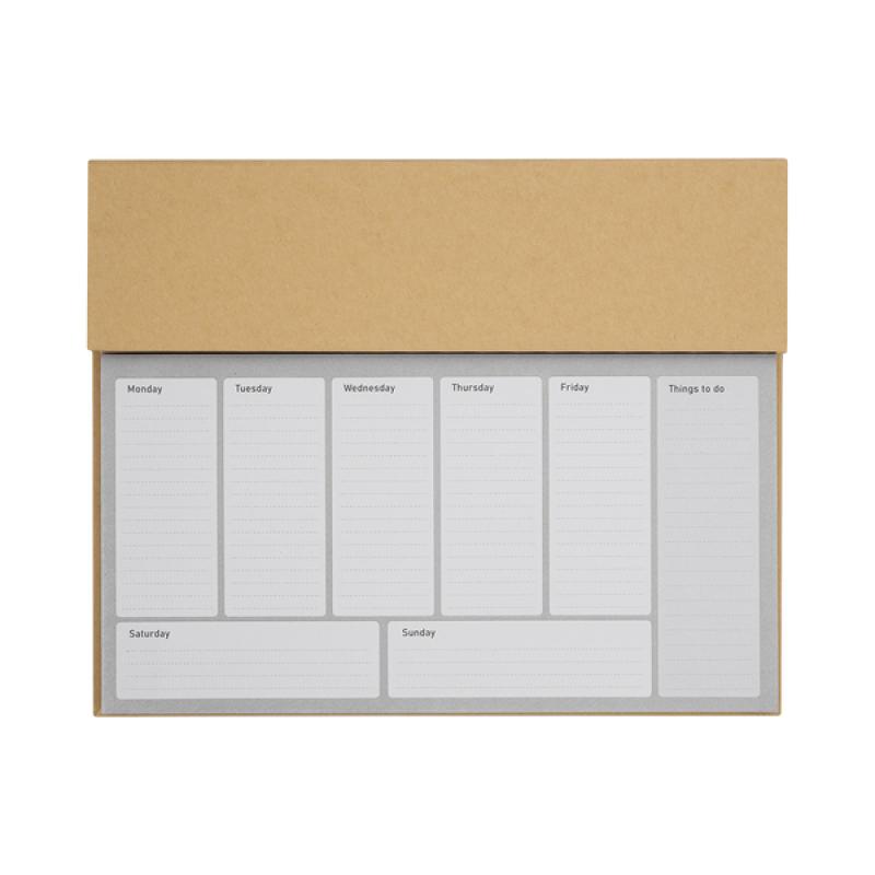 Planner na biurko w sztywnej oprawie. Zawiera 100 kartek z nadrukiem dni tygodnia i listą spraw do zrobienia (80 g/m2), drewnianą linijkę, długopis i papierowe znaczniki (25 sztuk w czterech kolorach, o gramaturze 75 g/m2).