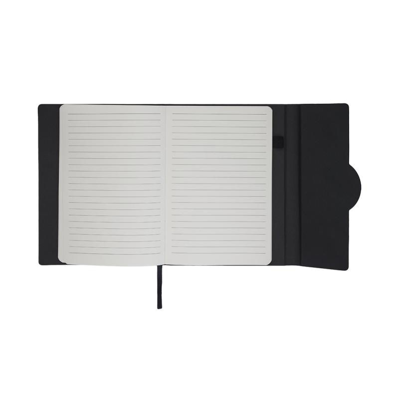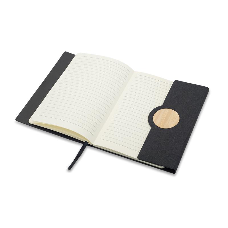 Elegancki notes w linie ( 80 arkuszy 70 g/m²) w twardej oprawie z tkaniny RPET, ozdobiony bambusowym elementem. Posiada uchwyt na długopis. Zamykany na magnetyczne zapięcie.