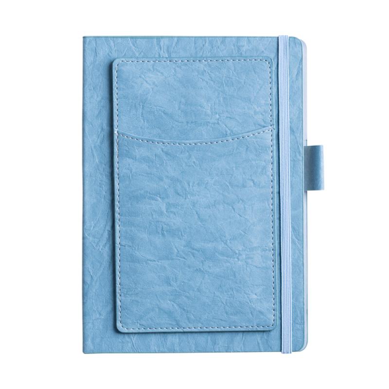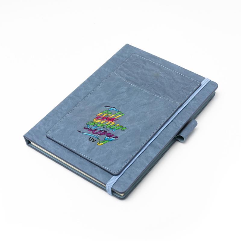 Notes w twardej oprawie z odłączanym etui na telefon, mocowanym na magnesy. 70 kartek w linie. Zamykany taśmą elastyczną. Doskonała propozycja na konferencje i do pracy w biurze. Posiada 25 sztuk karteczek samoprzylepnych, foliowe zakładki indeksujące 5 x 25 szt oraz uchwyt na długopis (nie dołączony)