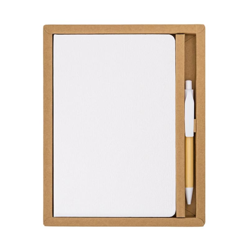 Zestaw składający się z notesu A5 w linie i długopisu. Notes w twardej oprawie z tasiemką do zaznaczania zapisanej ostatniej strony i elastyczną gumką chroniącą wnętrze. 80 kartek w kolorze kremowym (papier 70 g/m2). Bambusowy długopis, wyposażony w niebieski wkład. Zestaw pakowany jest w brązowe pudełko.