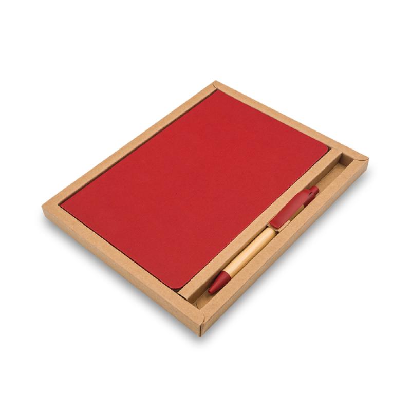 Zestaw składający się z notesu A5 w linie i długopisu. Notes w twardej oprawie z tasiemką do zaznaczania zapisanej ostatniej strony i elastyczną gumką chroniącą wnętrze. 80 kartek w kolorze kremowym (papier 70 g/m2). Bambusowy długopis, wyposażony w niebieski wkład. Zestaw pakowany jest w brązowe pudełko.