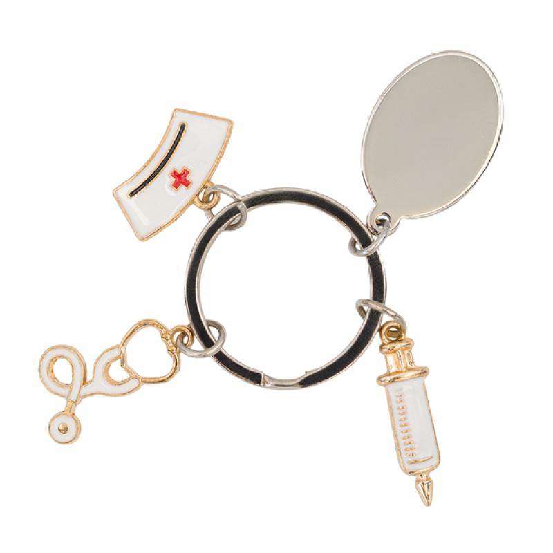 Metalowy brelok z medycznymi motywami. Zawiera 4 zawieszki: czepek pielęgniarski, stetoskop i strzykawka oraz zawieszka idealna pod grawer. Pakowany w czarne opakowanie upominkowe.
