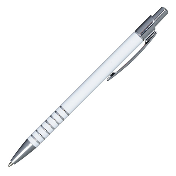 Aluminiowy długopis z metalową skuwką. Wyposażony w niebieski wkład.